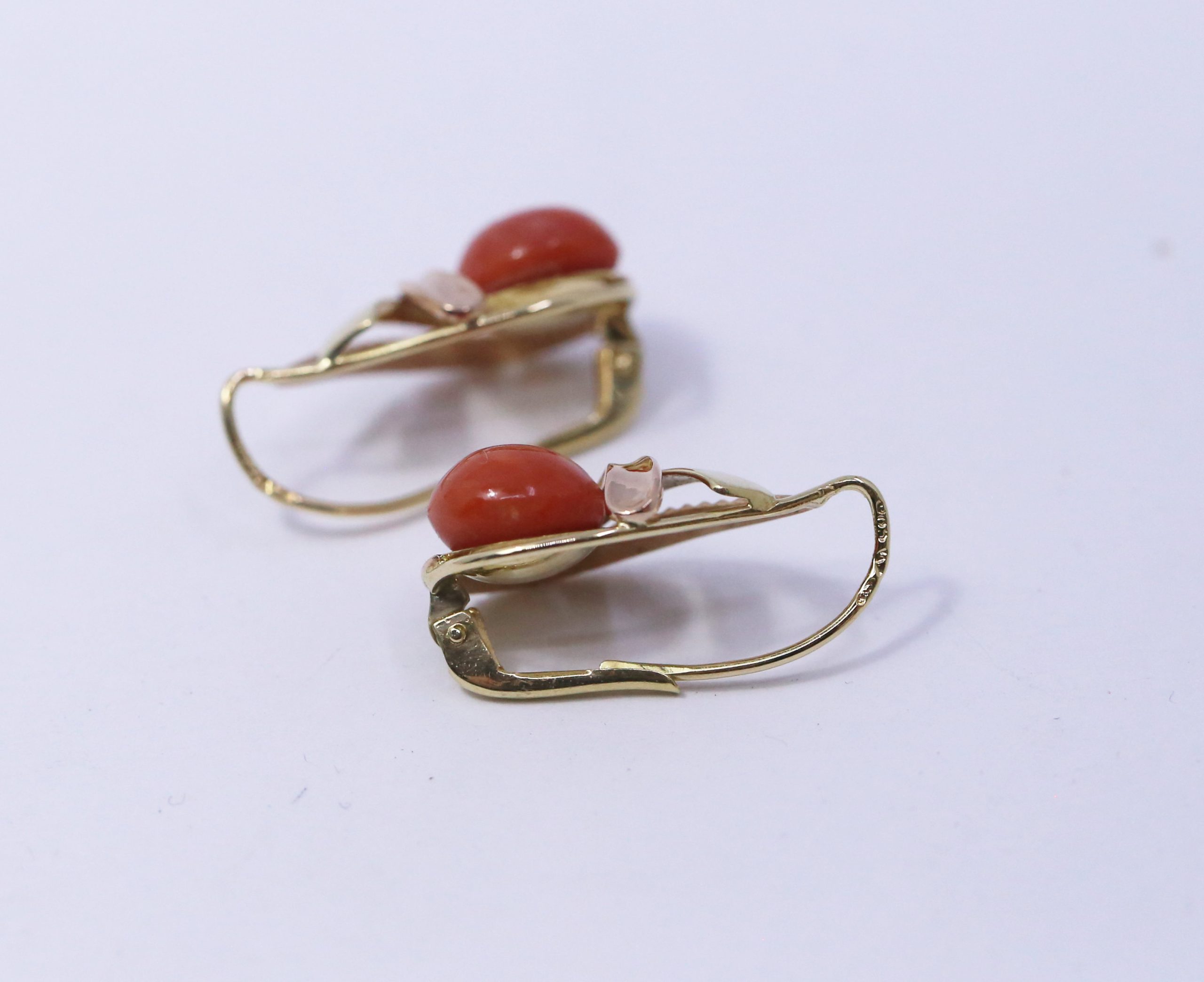 Zlaté dámské náušnice s přírodním korálem. Ryzost: 14k (585). Váha: 4,49g. Stav: použitý, ověřeno puncovní značkou.