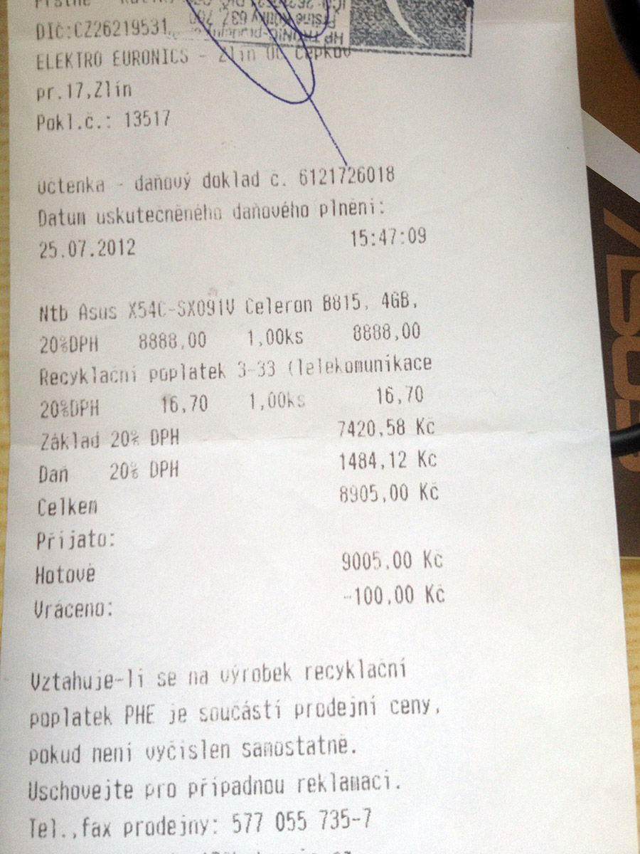 Notebook v záruce a byl zakoupený 25.7.2012 v EPROTONU ve Zlíně.