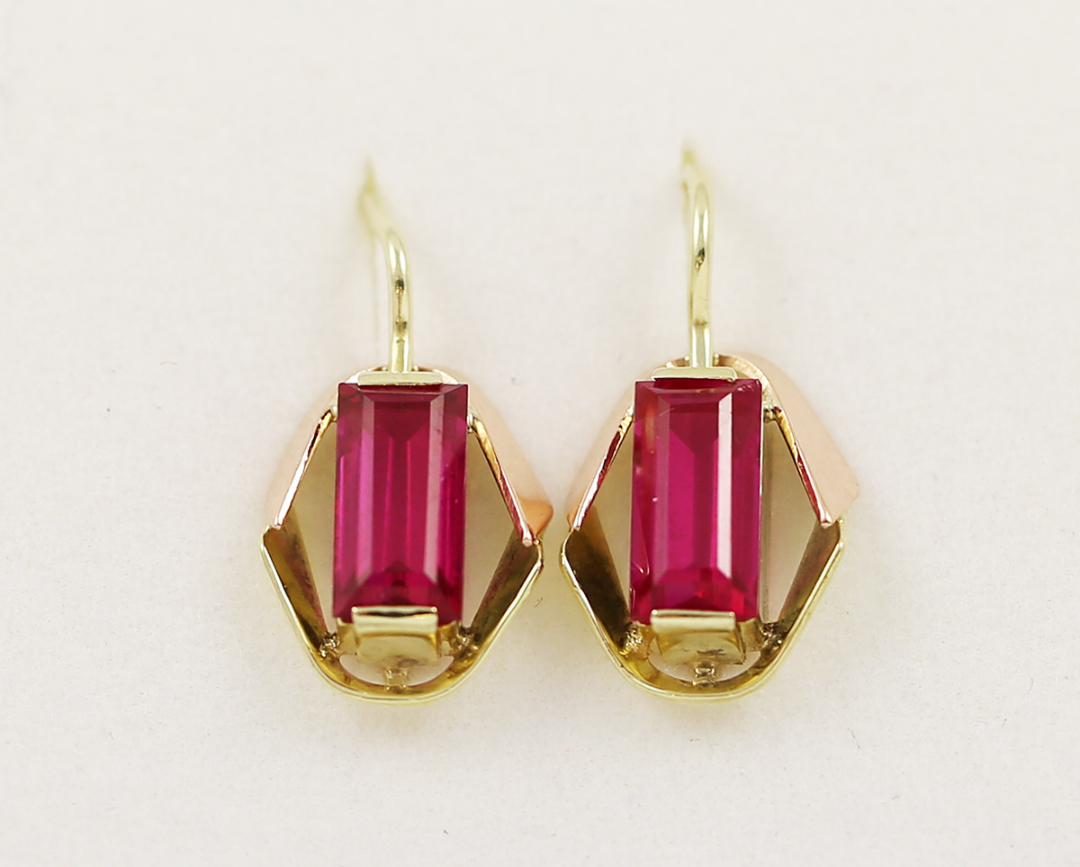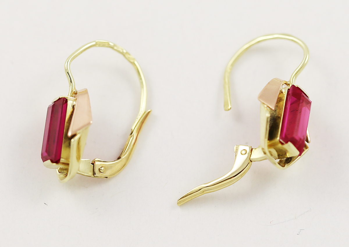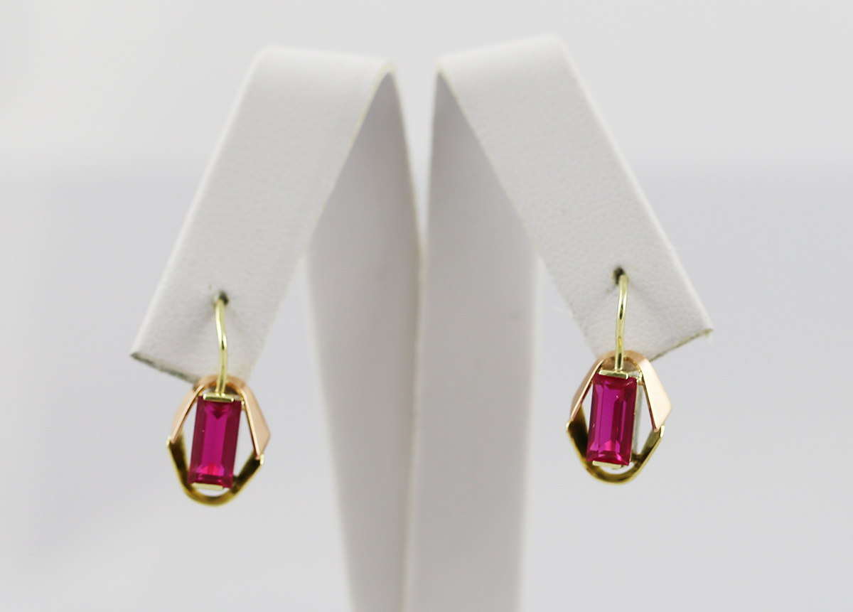 Nabízíme zlaté náušnice s červenými kameny ve tvaru obdélníku.