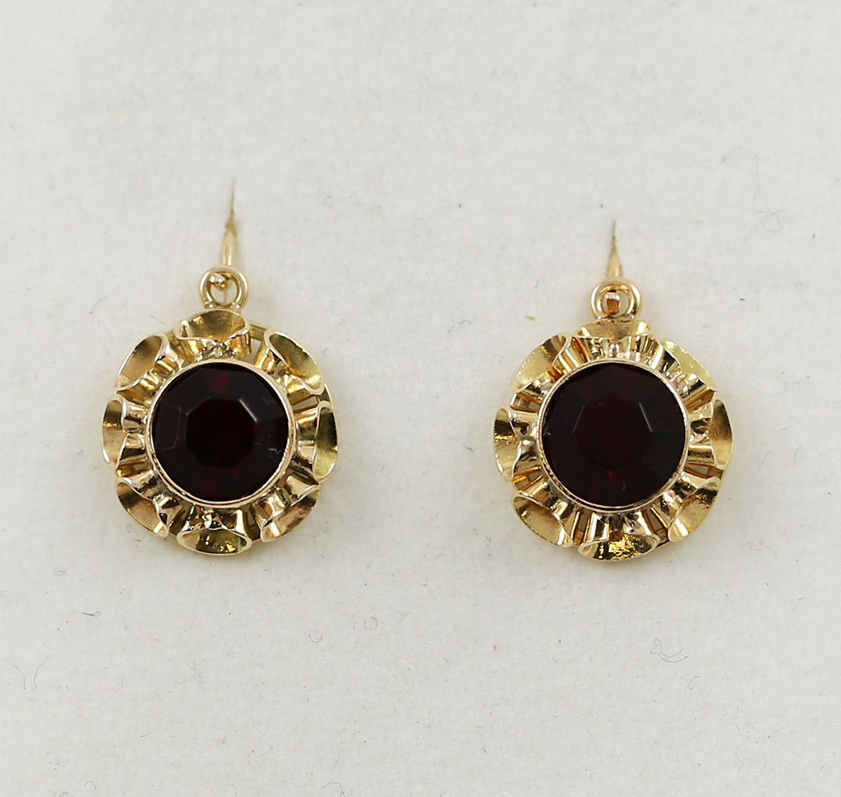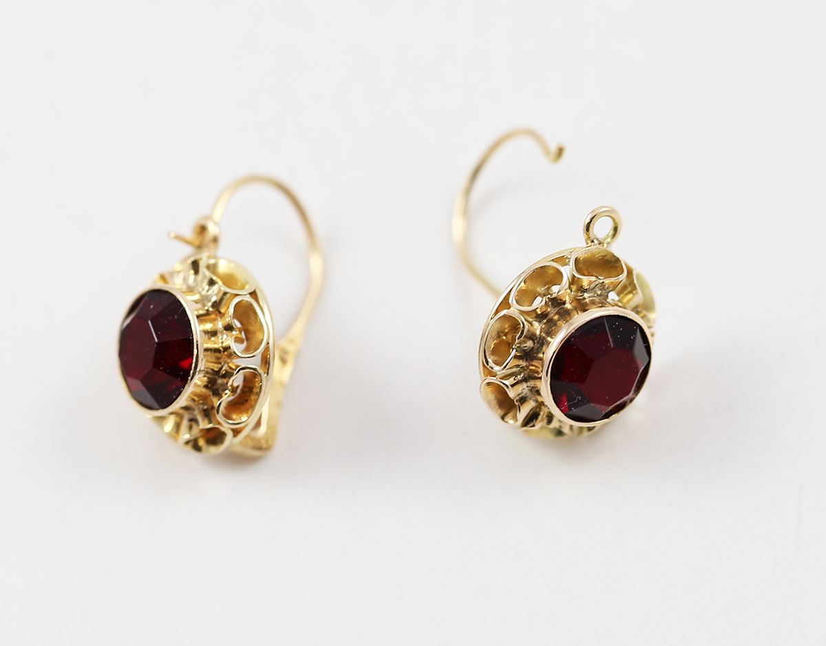 Nabízíme zlaté náušnice s tmavě rudými kameny.